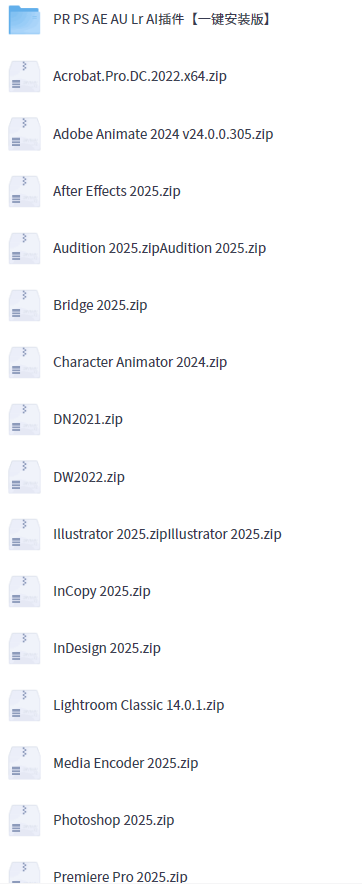 Acrobat.Pro.DC;Adobe Animate 2024;After Effects 2025;Audition 2025;Bridge 2025;Character Animator 2024;DN2021;DW2022;Illustrator 2025;InCopy 2025;InDesign 2025;Lightroom Classlc 14.0.1;Media Encoder 2025;Photoshop 2025;Premlere Pro 2025;